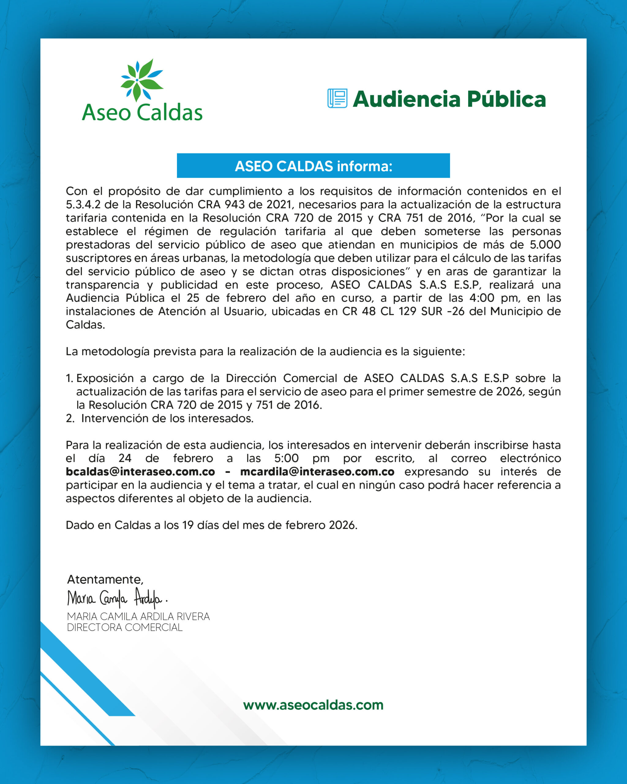 Misión: Liderar a través de un eficaz Servicio Público de Aseo, una cultura ciudadana basada en el respeto por el usuario y el medio ambiente, donde todos los Caldeños convivan en un entorno limpio y agradable.